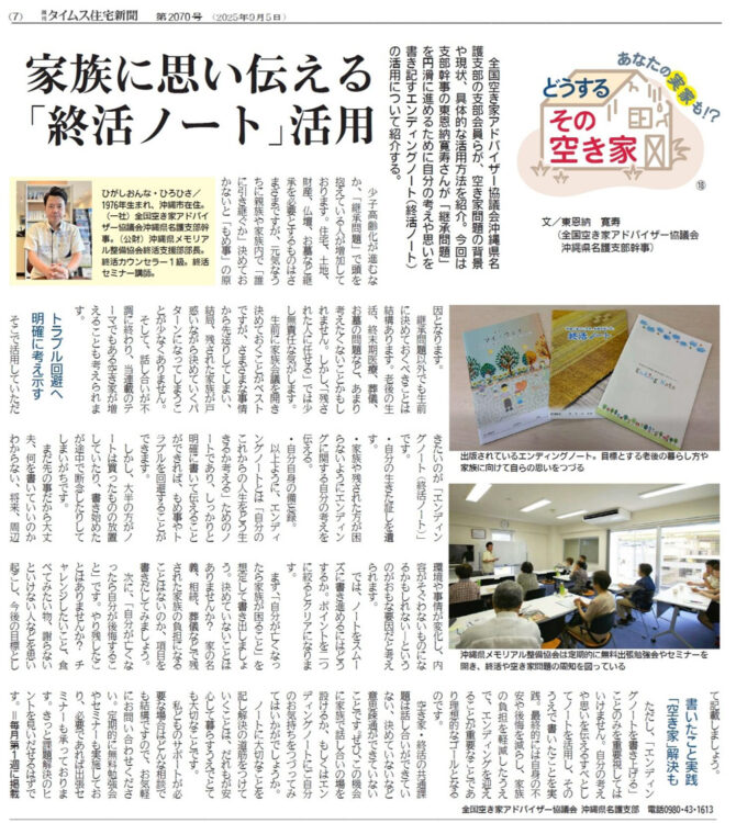 2025年9月5日の週刊タイムス住宅新聞に、 一般社団法人全国空き家アドバイザー協議会沖縄県名護支部幹事の東恩納寛寿さんが 「継承問題」を円滑に進める為に「終活ノート」の活用についての記事を掲載いただきました。 ※画像を […]