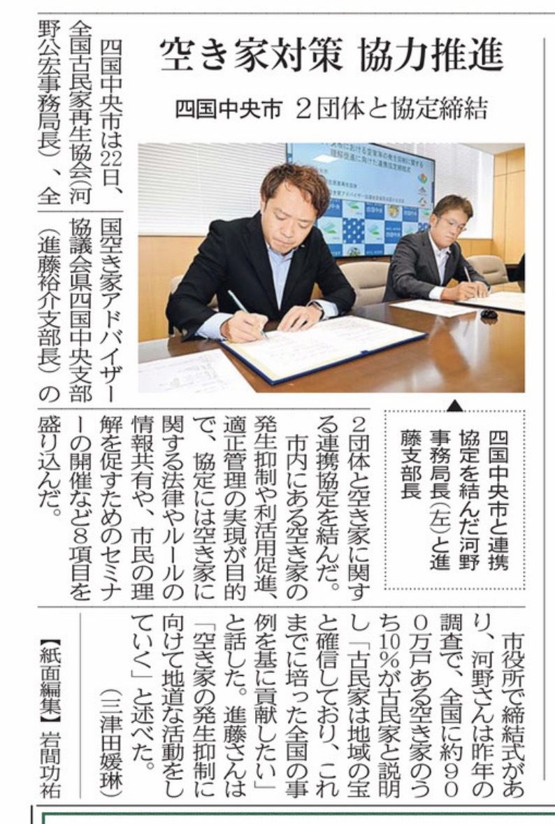 メディア 愛媛新聞に掲載いただきました。 2025年9月22日の愛媛新聞に、愛媛県四国中央市が一般社団法人全国古民家再生協会と 一般社団法人全国空き家アドバイザー協議会愛媛県四国中央支部の2団体の空き家に関する連携協定締結について掲載いただきました。 category:メディア | | 2025.09.22 « やんばる経済新聞に掲載いただきました。 沖縄県名護市より空家等管理活用支援法人指定をいただきました。(一般社団法人全国空き家アドバイザー協議会) »