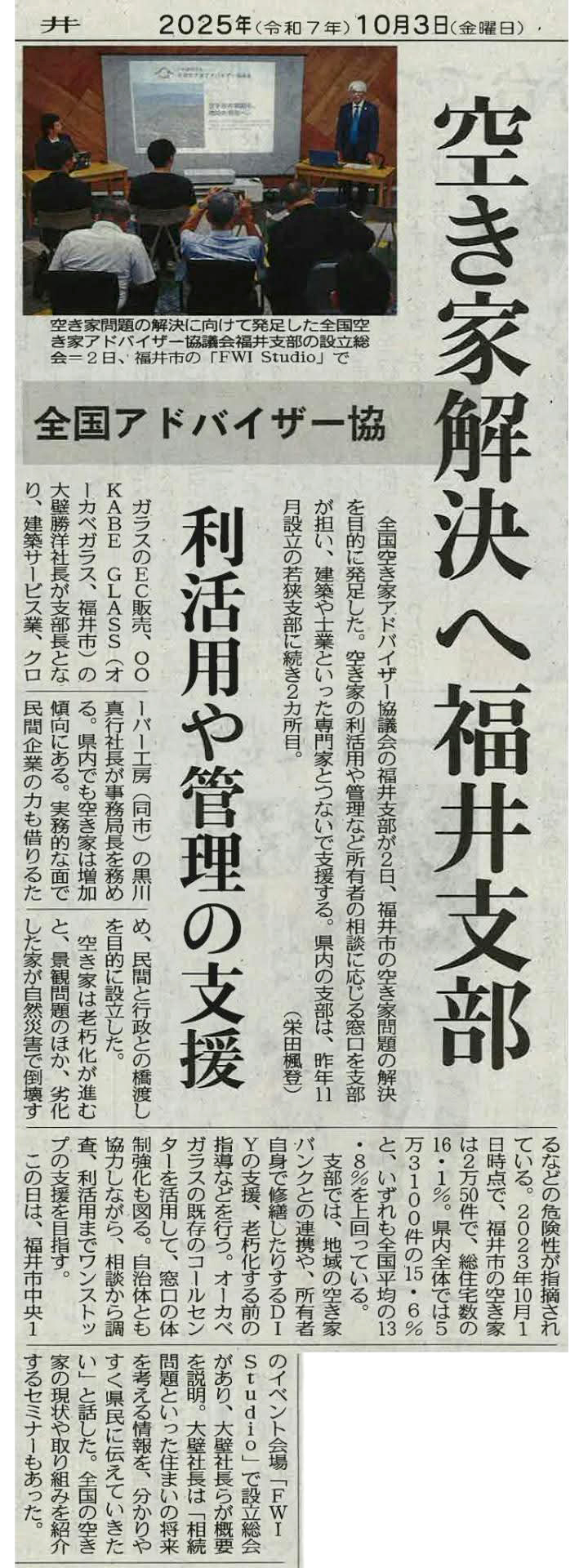 メディア 県民福井に掲載いただきました。 2025年10月3日の県民福井に、全国空き家アドバイザー協議会福井支部設立について 掲載いただきました。今後は福井地区の空き家課題解決について取り組んで参ります。 category:メディア | | 2025.10.07 « 週刊 愛媛経済レポートに掲載いただきました。 福井新聞に掲載いただきました。 »