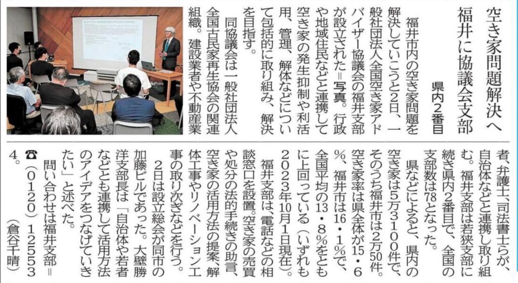 メディア 福井新聞に掲載いただきました。 2025年10月3日の県民福井に、全国空き家アドバイザー協議会福井支部設立について 掲載いただきました。今後は福井地区の空き家課題解決について取り組んで参ります。 category:メディア | | 2025.10.07 « 県民福井に掲載いただきました。 茨城新聞に掲載いただきました。 »