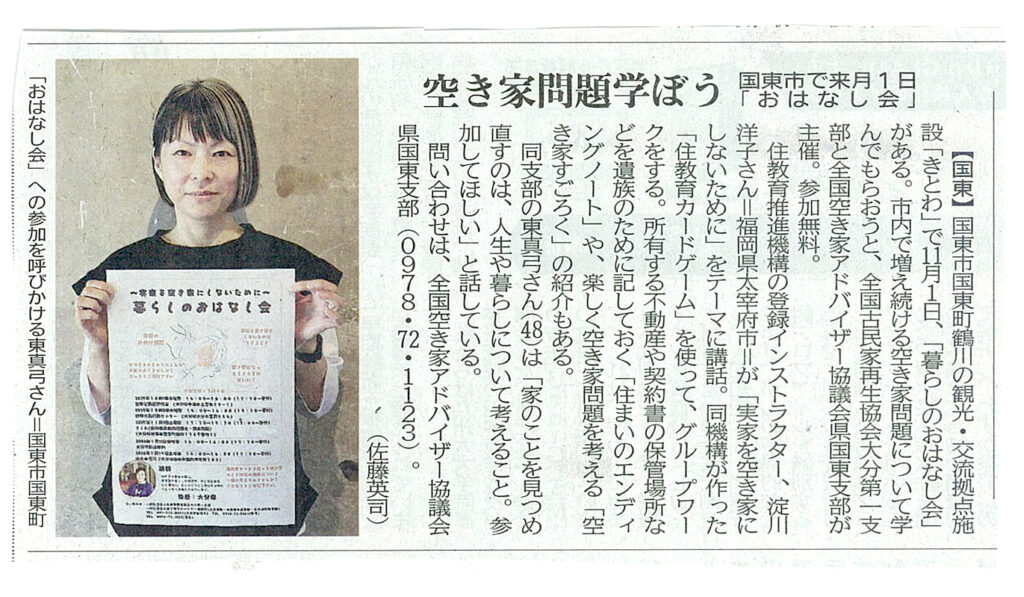 2025年10月27日の大分合同新聞に、一般社団法人全国空き家アドバイザー協議会大分県国東支部主催で11月1日に開催する「暮らしのおはなし会」について掲載いただきました。